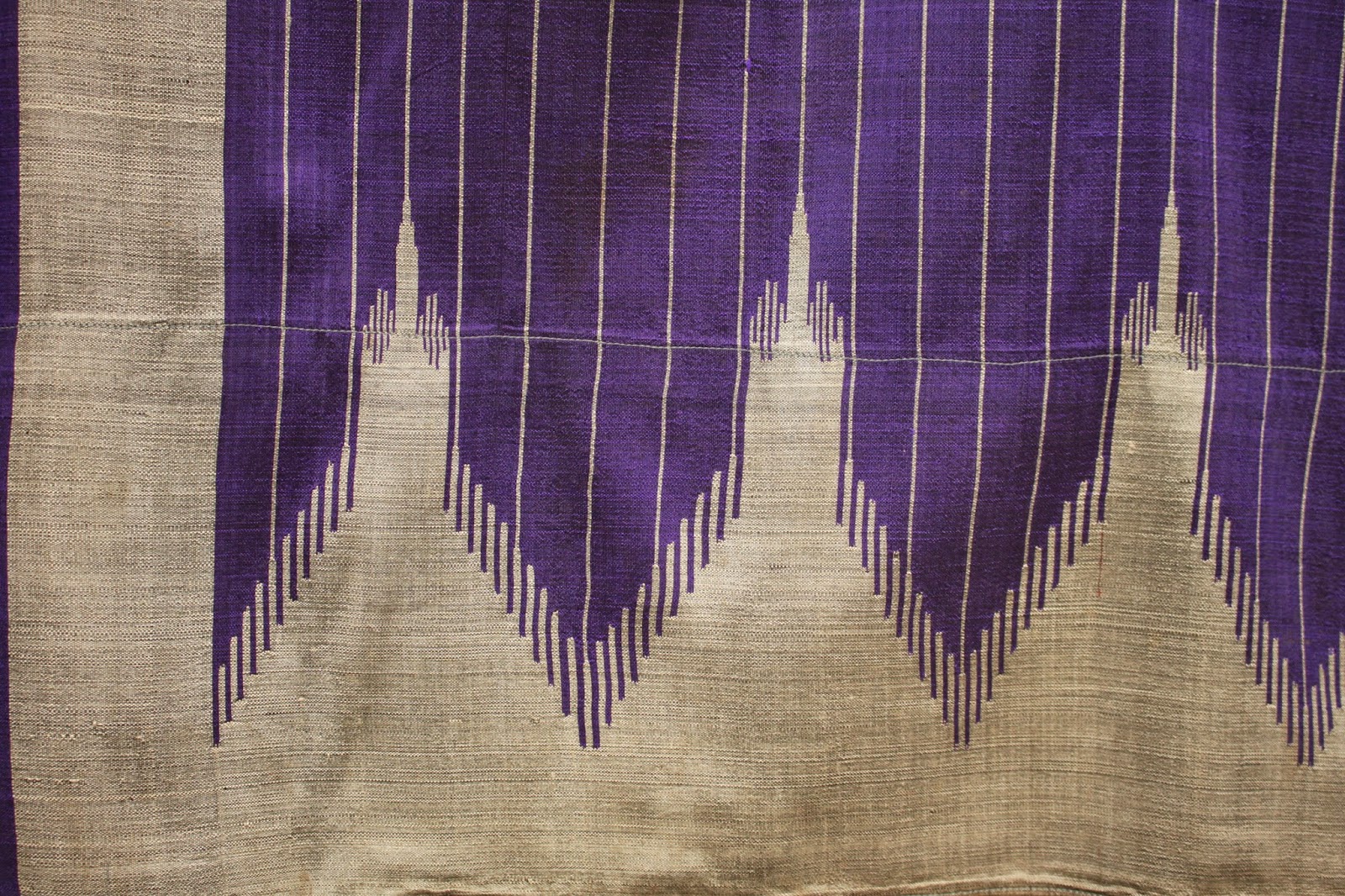 Related to my last post, this is an older hand-loomed silk panel from Aleppo, Syria with a saf design from the late 19th or early 20th century. The deep purple and silver silk is particularly fine and soft and in very good condition for its age with just a small fault in the upper left saf at the front and some marks to the back centre. Possibly made as a wrap for use after a hamam Turkish bath. The ends of the long rectangular panel 172cm x 95cm are stitched together at the back. For more photos see: www.tribal-art.org or www.kilim.ie