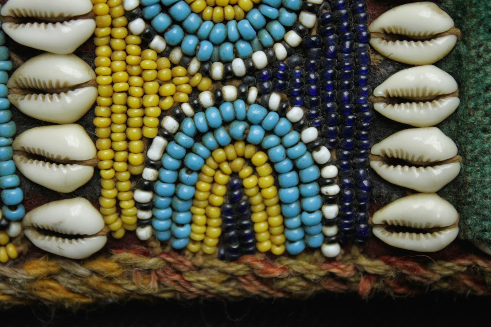 The bands incorporate a variety of materials and construction techniques. They are made using cowrie shells, hand made glass beads with intense colour, hand spun and dyed wool using natural dyes, goat hair bindings on the loops, felted wool fabric and plaited wool pom pom fasteners.